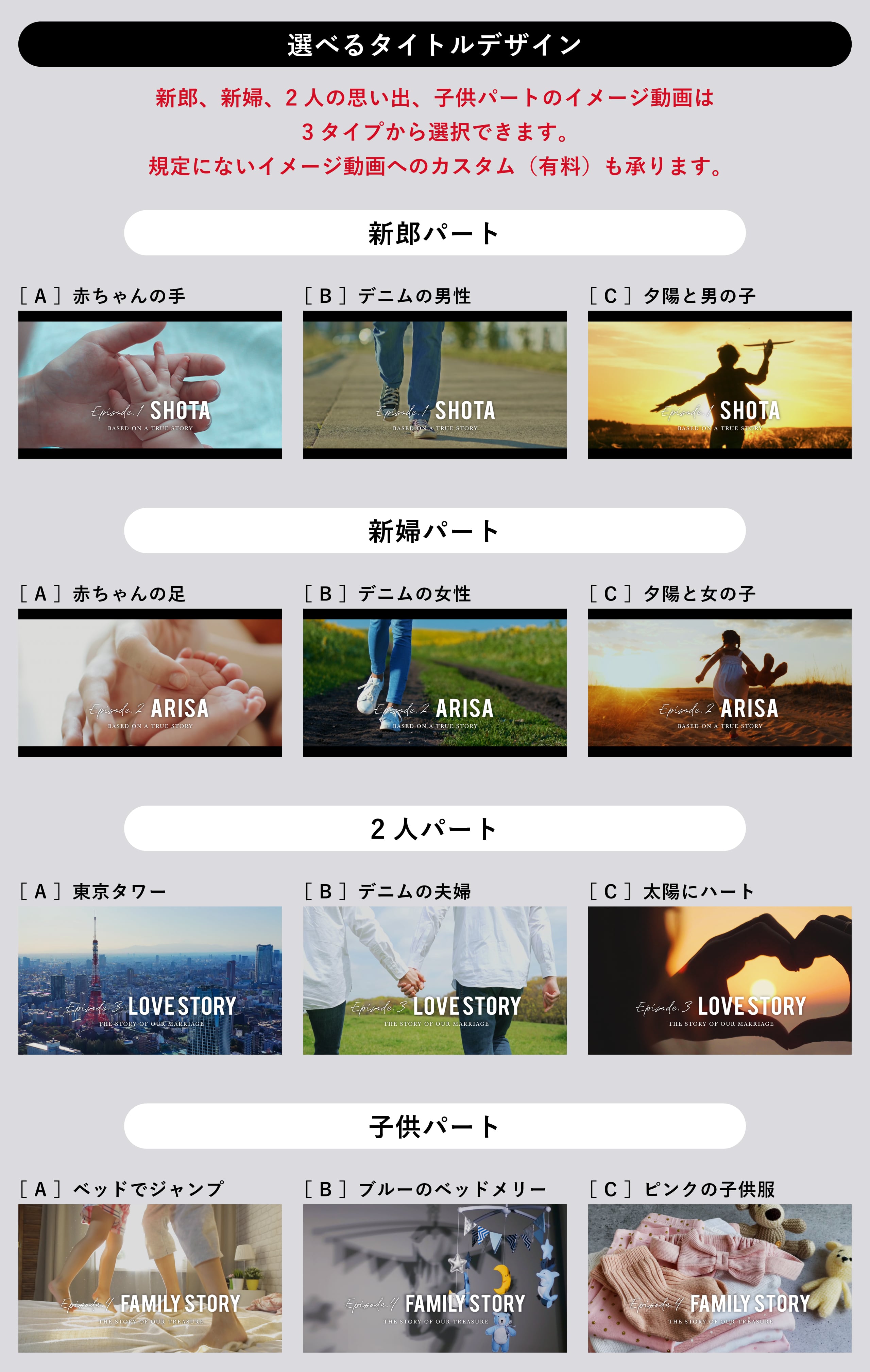 タイムズのオープニングはイニシャルが入る「モノグラムタイプ」とナレーションが入る「ボイスタイプ」、人生×僕達=が印象的な「クラシックタイプ」の3種類から選択できます。
